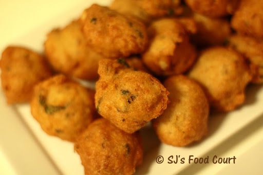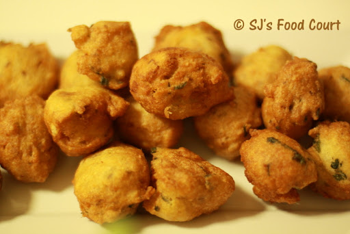 – Heat oil in deep-frying pan and put big spoonful of batter to make 5-6 bondas at a time.