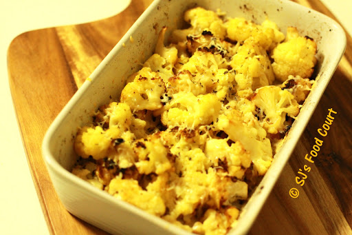 Already had a half head cauliflower in veggie rack n I got one more! Couldn’t think of anything else than combining it with cheese n simply bake, to accompany my creamy shell pasta for dinner :P