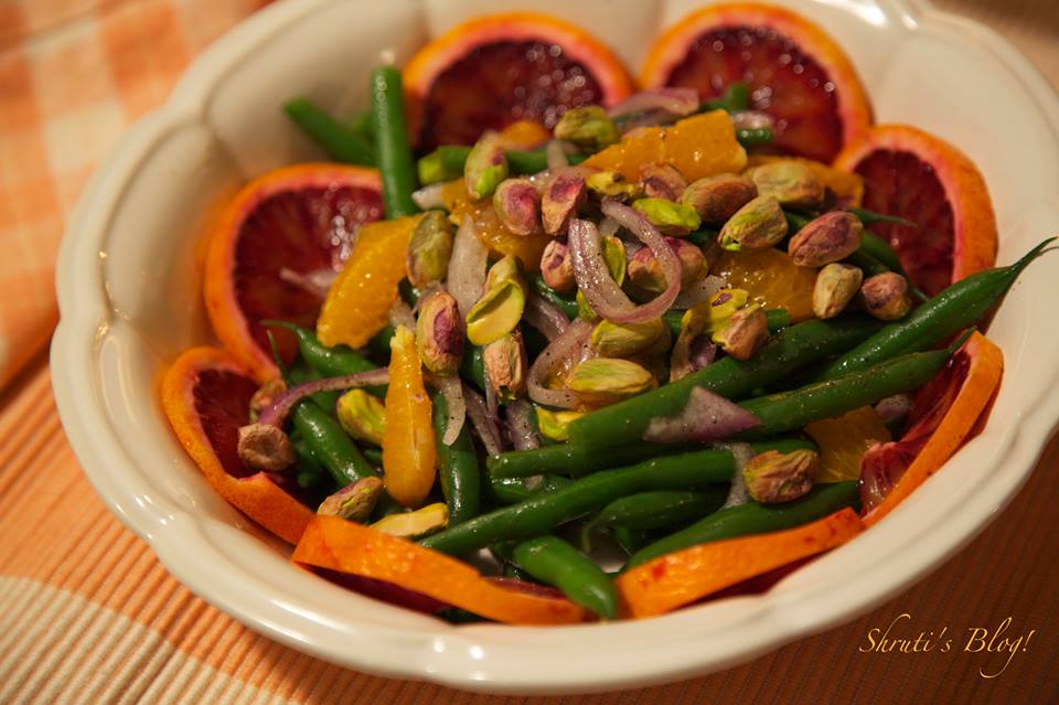 - Toss in the green beans and sliced onions in this dressing to combine and taste again for seasoning. Arrange the beans on a serving plate lined with the blood orange half- slices. Garnish the beans with tangelo sections and pistachios.
