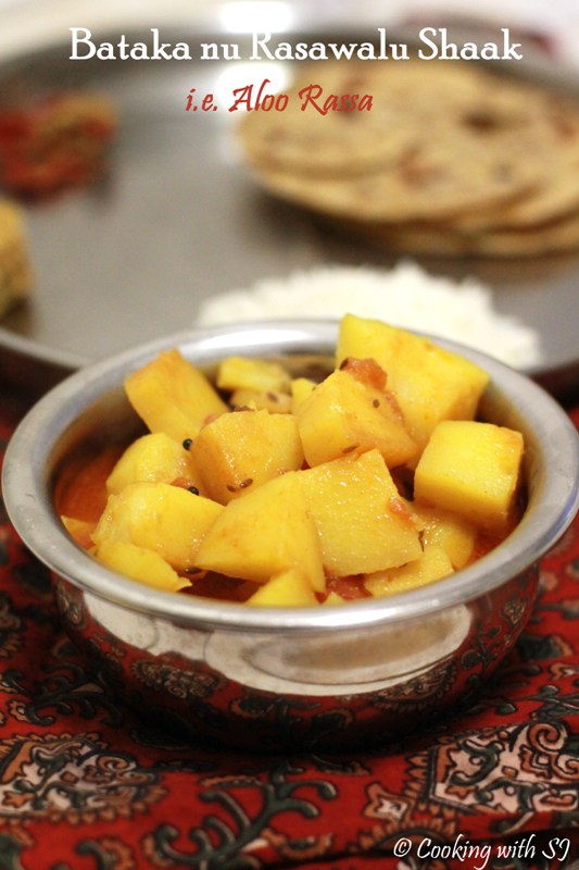 I certainly have a long list… But a few of them always stay on top of that list! They rule my kitchen always… One such gravy/subzi that is the most favorite, most comforting one is ‘Rasavalu Bataka nu Shaak‘ aka Aloo Rassa!!! All gujjus have their special recipe to make it sweet and sour at the same time :) And I make it a bit more tangy with sweet touch :) When I want to have something very simple in dinner or when I don’t want to eat much or even when I’m tempted to make something soothing, my first choice is always ‘Aloo Rassa’ :) So there’s no specific day or mood that I need for cooking it… Out of all basic Aloo preparations, this one is our favorite to have with a bowl of khichdi :)