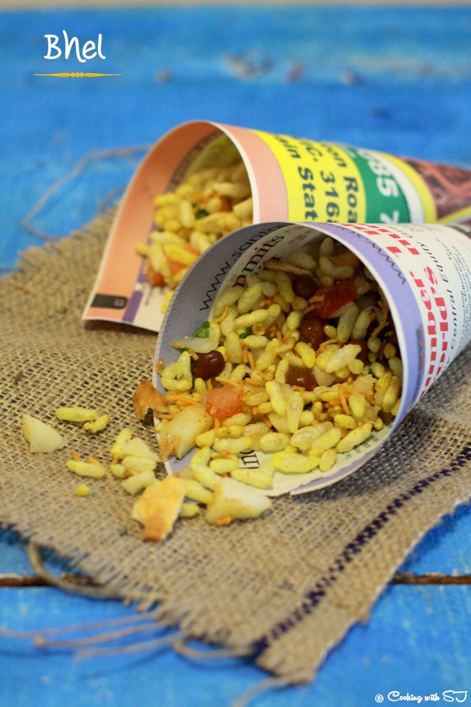 My fondest memory of foodie-days back in India is seeing a ‘Khumcha wala’, standing outside Pantaloons with his portable cart covered with red cloth… He used to make a cone using a piece of newspaper, put all ingredients of bhel inside, toss it quickly and sprinke a few spices along with lots of coriander leaves & namkeen sev on top before serving! And that all for just Rs. 10/- :) I wish… I could have it once at least during this visit :( Anyways, I made this yummylicious ‘Bhel’ last week in-house…