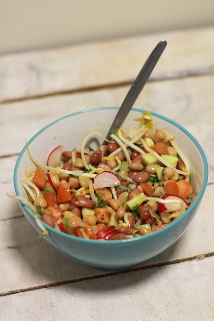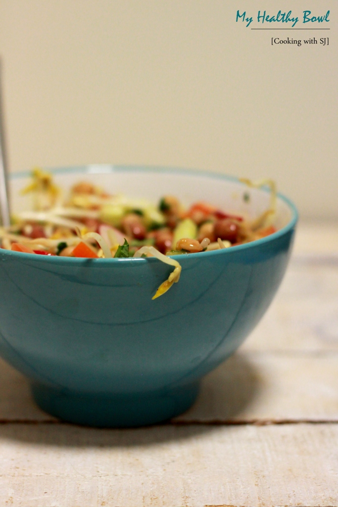 “A bowl of salad keeps a doctor away” :P Modified version of the saying… No matter how much I control on oil & plain flour, I have to have these bowls at least 4-5 times a day… And possibly everyday!!! I was too tired to make separate salad bowls with all ingredients I had that night. And so I thought of throwing in everything at once :P But believe me, it was yummm!!!