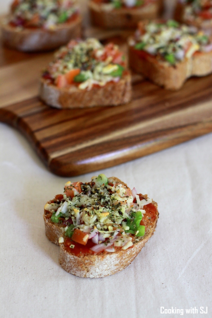 Well, I definitely miss turning on my oven often so thought of baking something for an evening snack! Yes… something that’s savory and can be prepared in no-time… It’s an easy-peasy one to make… And most of you must have done it many times before! Even I have but then did it for the first time with french baguette. I fell in love with these little beauties even before I tasted it. And later, I realized I should have used parmesan instead of pizza cheese-mix just to give a rustic touch!!! May be… next time :)