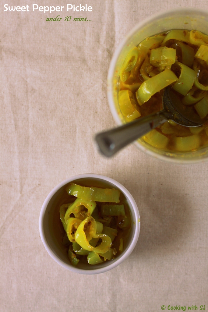 Long time since I cooked something with fellow-blogger’s recipe!!! And yes… today I’m here with a pickling post! How I loved this quick and super-easy pickle… A lovely buddy, Sonal of SimplyVegetarian777 posted this one recently and it was stuck in my mind. As I can’t handle spiced stuff at all, I preferred using sweet chilly peppers instead of hot green chillies :D