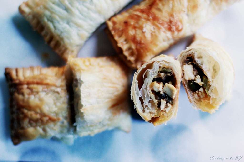Sometime back, a foodie-buddy Nidhi made these puffs! Ohh yes, she made a batch for India vs. South Africa match… What if I wasn’t going to go stadium? I also baked a small batch for two of us ;) The combination of ingredients worked too good… Mushrooms, Olives, Paneer and Capsicum!!! “Win-Win” it was. Yes, India won and these puffs too ;) Here you go with her ingredients with my Indian spices-addition…