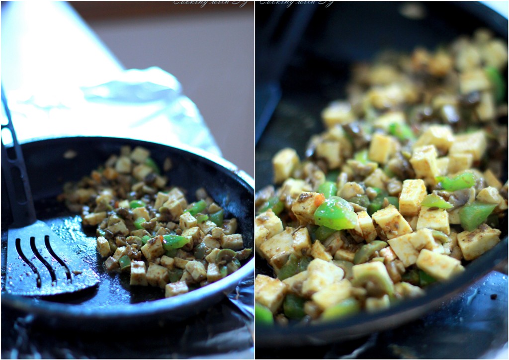 - Heat olive oil and add mushrooms, paneer and capsicum into it.