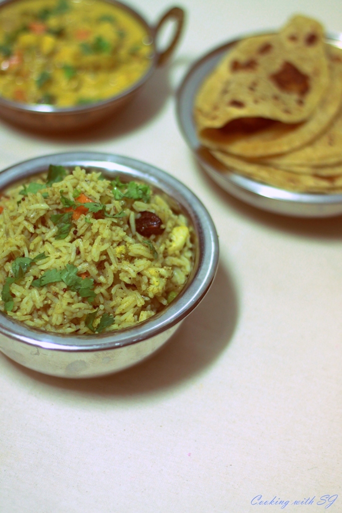 I have made rice dishes many times in last month or 2! Either I’m too buzy to cook a nice spread… Or I’m just being lazy ;) I have posted many of them before… But this one was, so far the most appreciated one by hubby! He absolutely loved the simplicity with flavors. I asked the creator of this pulao for the recipe.. and when she shared, I made it that day itself for dinner :P Although I made Veg Jaipuri & Paratha to go along, I couldn’t concentrate on gravy at all!!! And adding more to it, hubby (who never lets me pack a tiffin) asked to pack it too :D Blisssss…