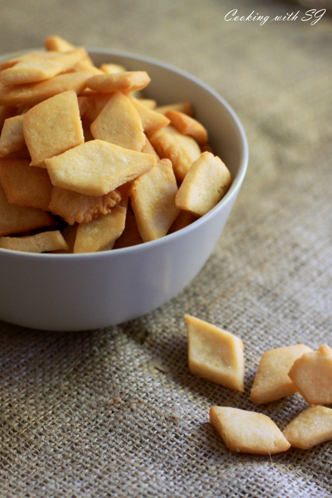 That’s one of the best things to munch… with a cupppa tea or coffee or milk or even with lemonade :P I had always made namakpare (salted diamond crackers) but couldn’t resist making this one when I had leftover sugar syrup from GulabJamun! Here is how I did it…